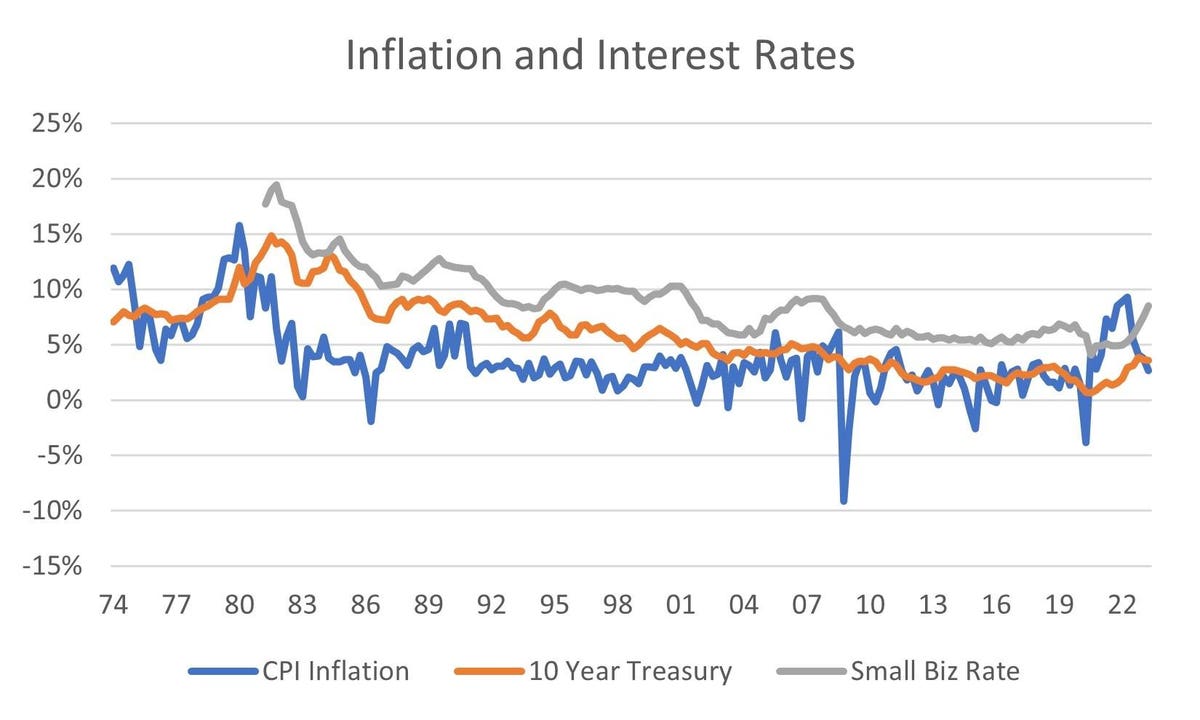 High inflation is more than a tax on everyday spending, it also impacts longer run costs through higher interest rates. Chart 1 shows the relationship between inflation (blue line), interest rates (orange line), and the rate paid by small business owners on their loans (gray line). The recent decline from near 10% inflation rates should work its way through to lower interest rates for consumer and businesses, assuming no “setbacks” like those experienced in the late 1970s and early 1980s. But just how much depends on what lenders “expect” inflation to be in the future when loans are repaid.